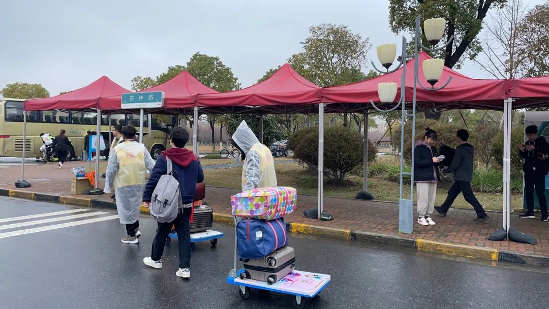 校门口,志愿者们帮助同学打印、收取进校报到单,接驳车站点,志愿者们帮助同学们搬运行李,接驳车上,志愿者们帮助同学们路线导航……报到沿途,处处都有志愿者们忙碌的身影。
