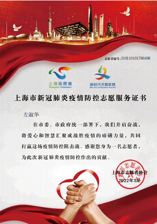 本学期左淑华老师还承担了《英语词汇学》和《英语语法》的教学任务,在完成线上教学任务后,她积极践行党员“双报到”要求并投身社区志愿者服务,于近日收到《志愿者服务电子证书》,用言传身教书写了人民教师和共产党员应有的形象。