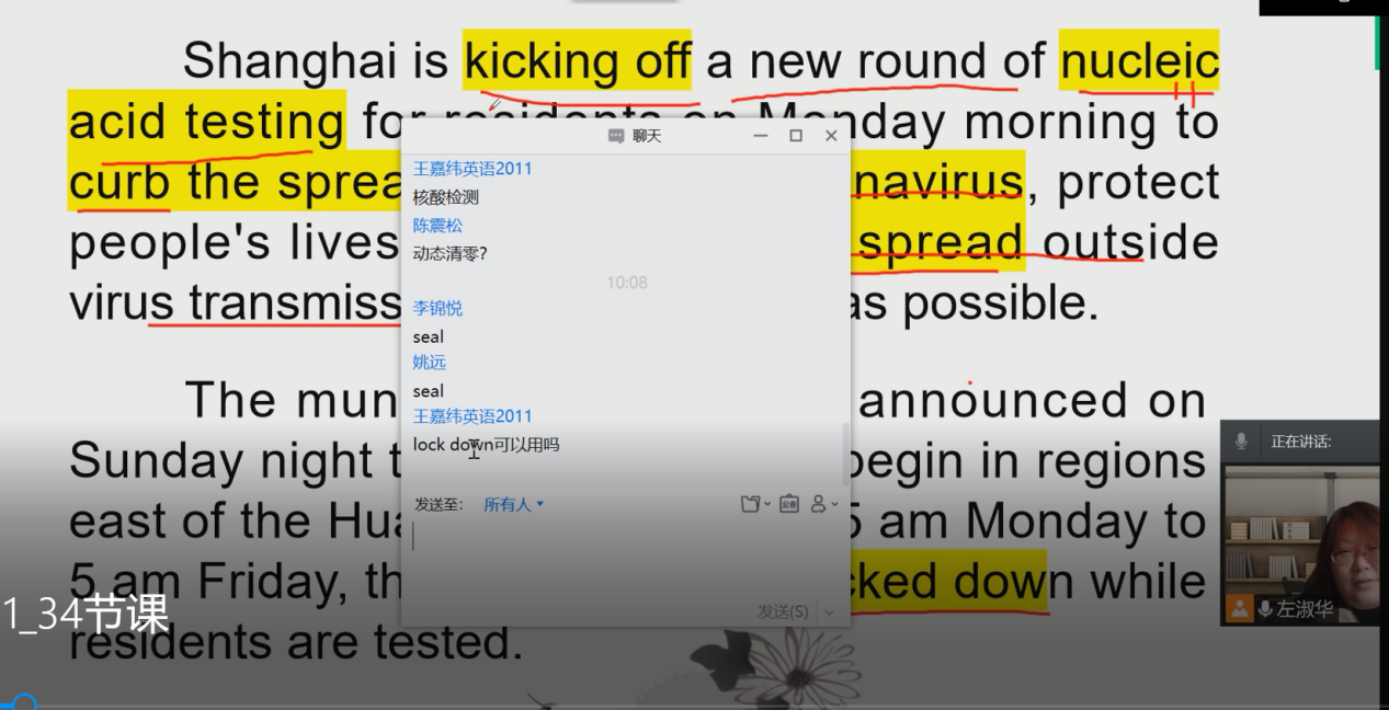 授课过程中,左淑华老师积极融入《政府工作报告》、疫情新闻和冬残奥运会的介绍等内容,使同学们不仅对热词有了更多的了解,因疫情被封控管理产生的不良情绪也得到了有效疏导,更重要的是使大家真切感受到了抗疫斗争中不畏困难的精神。