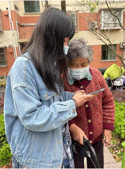 居委老师安排给任雯霁的任务是帮助小区里不会使用智能手机的老人们登记信息生成核酸检测用的二维码。作为一个老龄化程度较高的社区,这无疑是一项艰巨的任务,很多老人想要检测的心情十分急切,一大早便一窝蜂走出居民楼排起了长队,这时候不仅要维持好现场的秩序,还要耐心地解答从四面八方抛来的各种问题,“为什么我没有二维码?”“身份证在楼上没有带下来怎么办?”我已经点击登记了为什么不显示二维码?”老人们年纪大了,行动迟缓,反应也不是很迅速,常常需要花费比和普通成年人多得多的时间进行解释工作,特别是住在她家对面的一个爷爷,因为患有耳疾,如果不佩戴助听器根本听不到外界的声音,在轮到居民楼核酸检测的时候经常要两三名志愿者一起用力敲他的家门,运气好才能等到他来开门……任雯霁说她平时是一个内向的人,但在她生活的社区,很多爷爷奶奶都是看着她从小长到大,所以都很好说话,在他们的理解和支持下,工作完成得十分顺利,持续了一上午的工作一眨眼便过去了。