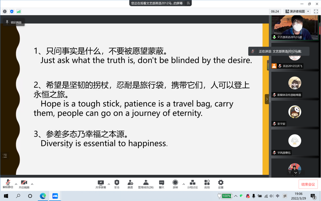 即使是在线上,同学们对于参加活动的热情依旧,对于自己向大家推荐的作品充满自信,仍能绘声绘色地表达出来,令大家耳目一新。本次分享会的书籍类型种类多,从古至今,由中国到世界。大家从作者对学习、生活、未来的相关感悟都获益良多,直播间里充满了欢乐。
