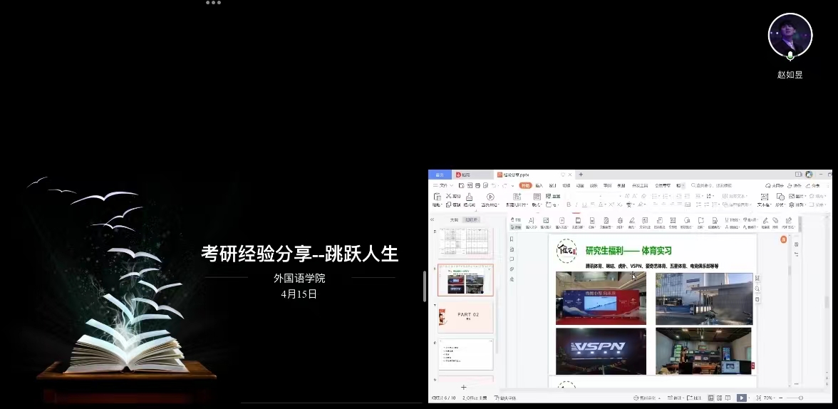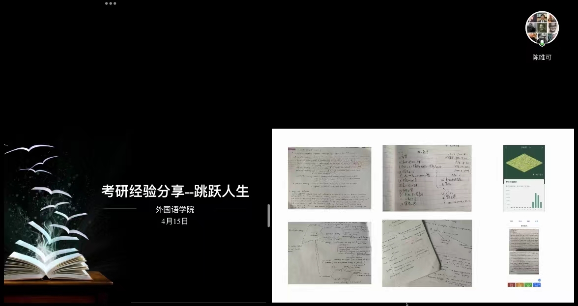 跳跃人生——考研经验主题分享会邀请了2021年参加考研上岸的3位同学陈唯可(北京大学录取)、赵如昱(上海体育公司录取)、袁玉昊(浙江理工大学录取),他们结合自己的备考过程与复试经历从复习计划、专业选择、院校选择、专业备考等几方面进行了分享。
