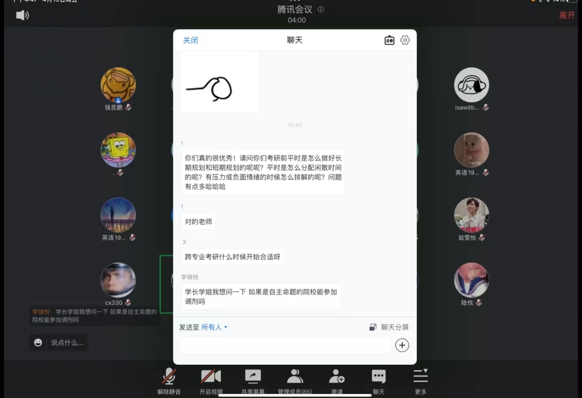 两次主题分享会,同学们积极踊跃向学长、学姐提问,反响强烈,每位考研成功的同学都耐心回复相关问题。最后也为所有同学送上寄语:在迷茫的时候,少一份畅想,多一份尝试;在尝试的实践中,不怕犯错,多去积累;在积累的过程中,不断总结,厚积薄发。海压竹枝低复举,风吹山角晦还明。扎实学习,脚踏实地,结果定不负一番努力。加油!