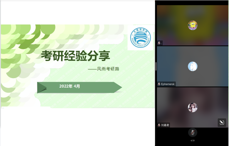 风雨路途——考研经验主题分享会邀请了本校3位不同考研经历的研究生张闻东、程淼、郭懿,他们主要结合自身考研经历主要从考研抉择、复习方法、心态调整等3方面进行了分享,为每位准备考研以及正在考研的同学树立了信心。