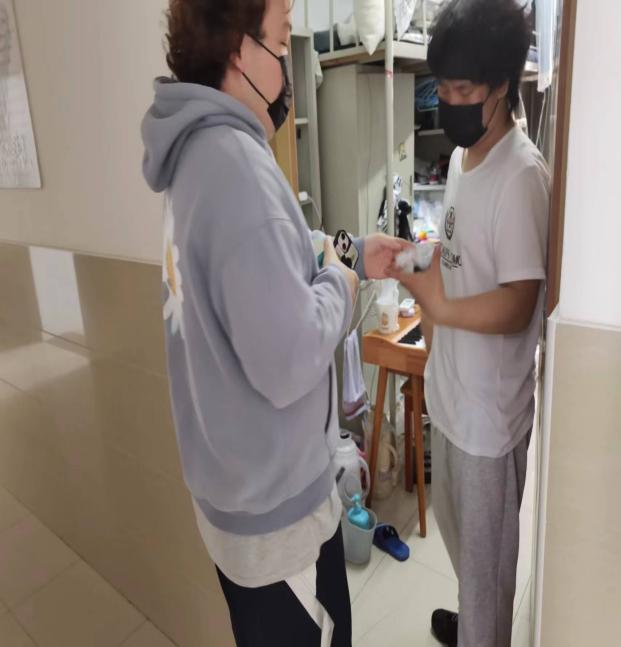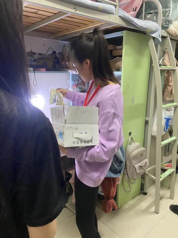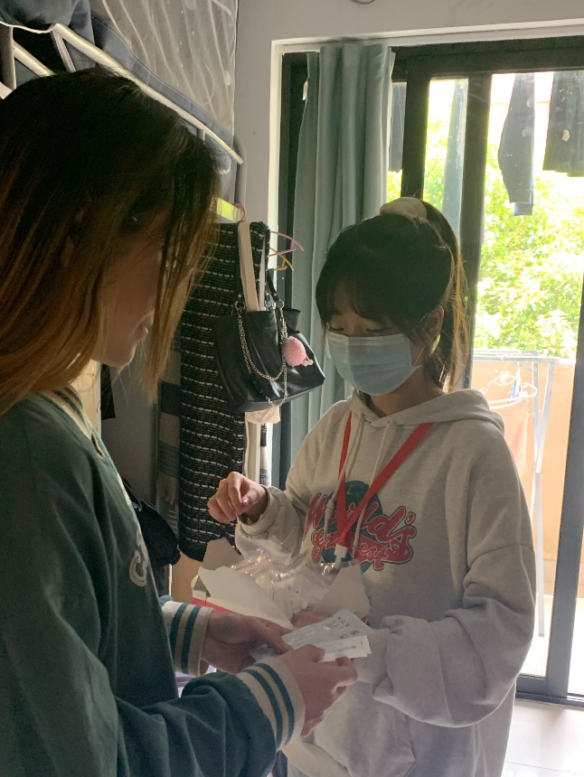 志愿者工作很简单,按照老师的安排,定时发放抗原试剂,保证自己负责的每位同学都检测到位,登记在场馆活动的同学,提醒外出的同学不要离开生活区等等。