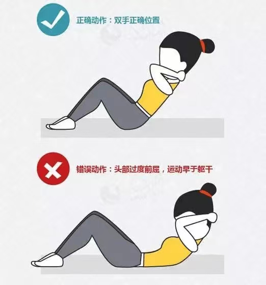 a.躺于垫上,手臂抱头于头部两侧,脚底并拢,脚跟靠近臀部,腹肌发力起身;