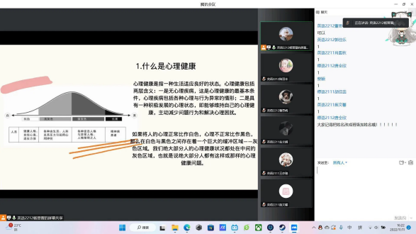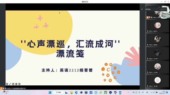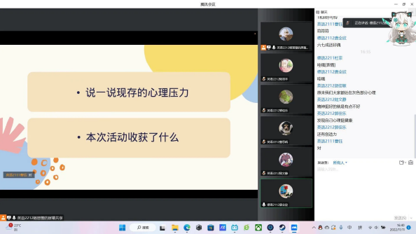 为进一步丰富老员工的课余生活,增进同学们之间的相互了解,yl23411永利集团学风部于20221111日下午,在腾讯会议顺利举行以“心声漂流笺”为主题的心理月活动。