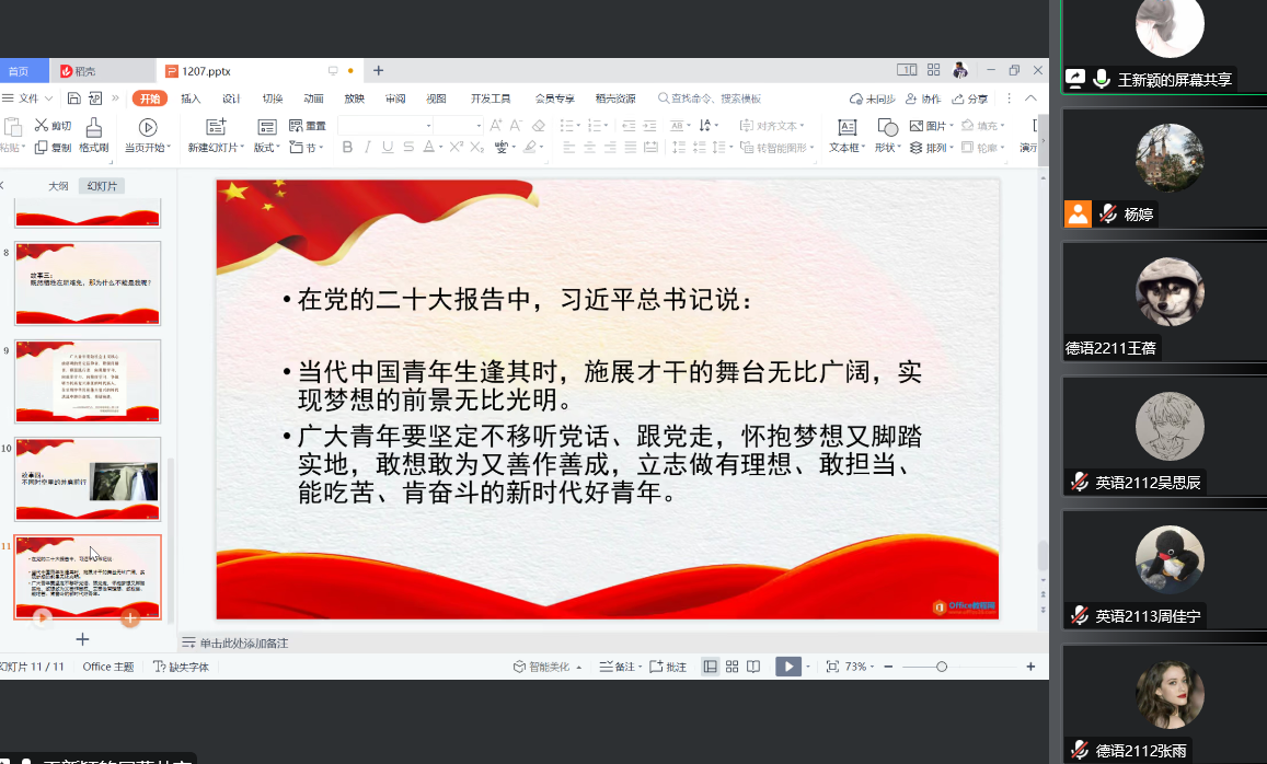 讲座结束后,专职组织员杨婷强调,同学们一定要端正入党动机,坚定理想信念。在校期间要主动参与各项活动,团结帮助同学,积极向党组织靠拢,响应习近平总书记对广大青年的号召,争做社会主义核心价值观的坚定信仰者、积极传播者、模范践行者,向英雄学习、向前辈学习、向榜样学习,争做堪当民族复兴重任的时代新人,在实现中华民族伟大复兴的时代洪流中踔厉奋发、勇毅前进。