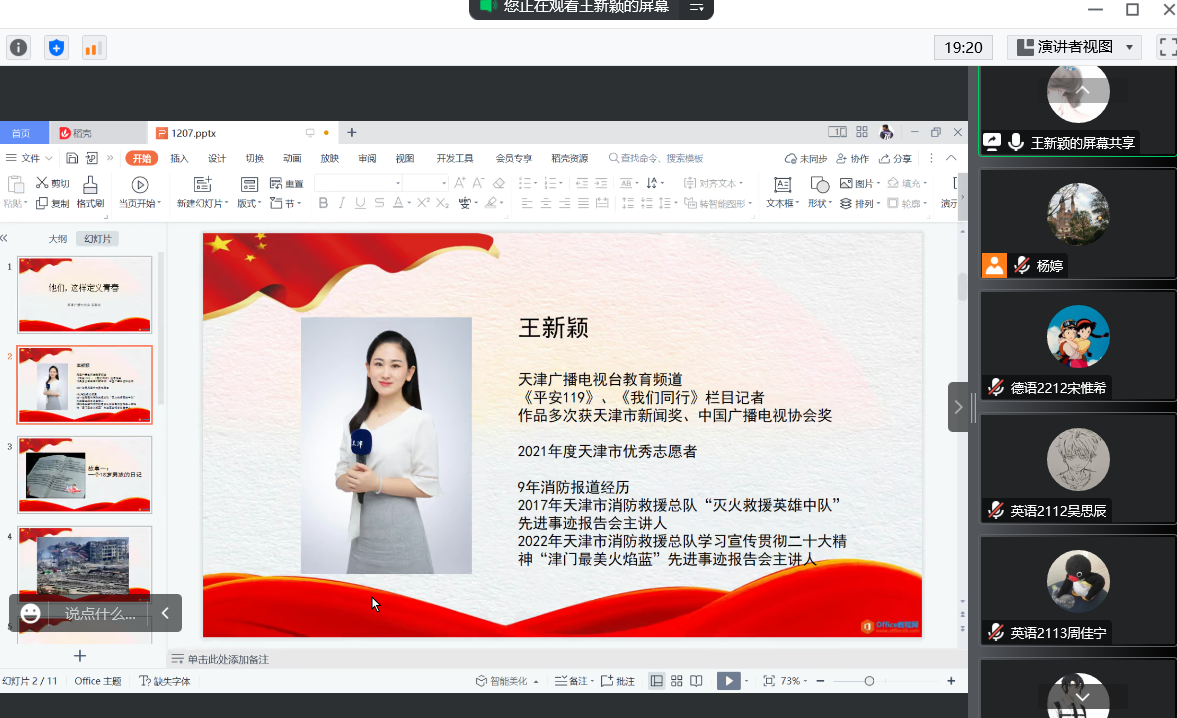 王新颖作为一名长期在消防战线采访的一线记者,她从自己亲身经历过的几个消防故事入手,深入浅出地展示了党员在危难时期身先士卒的高尚品德。通过真实实例的讲述,她谈到 “举旗定向,高效有力,坚定中国共产党的领导核心。万众一心,勇往直前,续写中华民族的英雄史诗;不忘初心,深入群众,牵住党和国家发展的生命线”,是当代中国发展的现代化方向。
