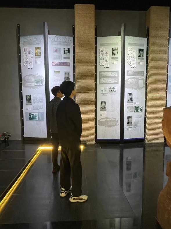向西拾级而上,是一座三层结构的革命烈士生平事迹陈列馆。陈列馆由人物厅、解放厅、文学厅、影视厅、“双拥”国防教育馆5个展厅组成。陈列馆西侧是占地8000多平方米的烈士墓区,墓区呈梯田状分布,安葬着各个时期因战因公而牺牲的183位革命烈士的忠骨。同学们在展厅里驻足凝视,通过那一张张图片、一件件物品清晰地感受到了先烈们不怕牺牲的精神。