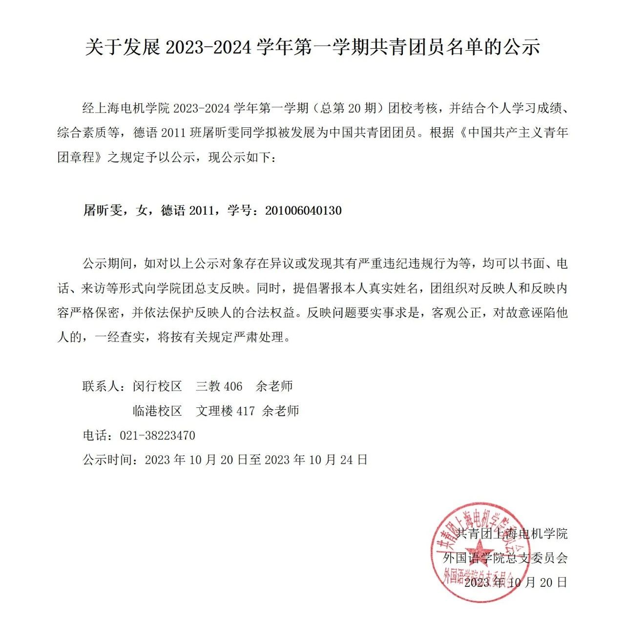 yl23411永利集团关于发展2023-2024学年第一学期共青团员名单的公示