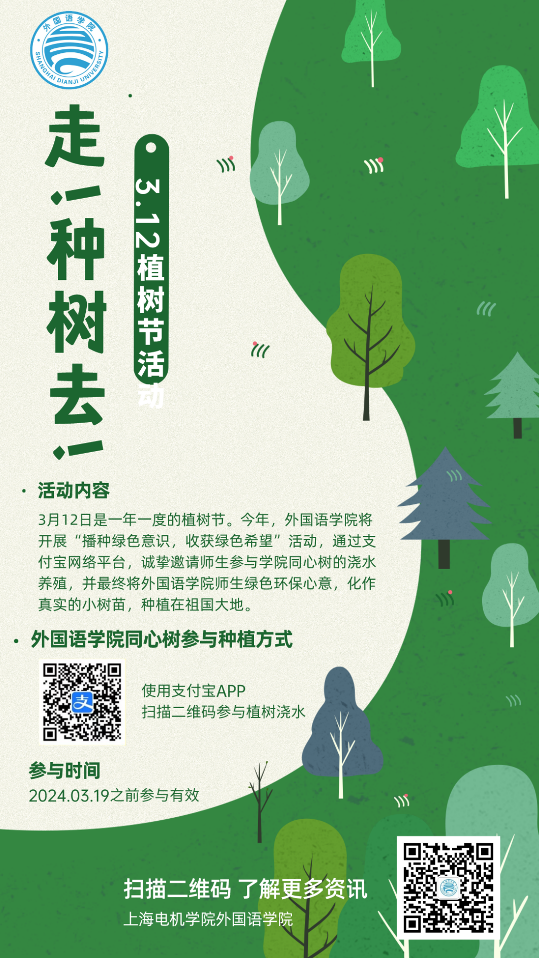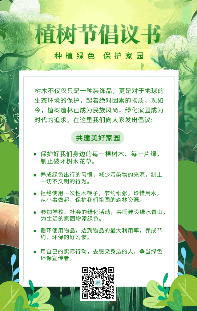 今年植树节,yl23411永利集团将开展“播种绿色意识,收获绿色希望”活动,将绿色环保理念通过师生一同的努力,化作真实的小树苗种植在祖国大地。同时,我们在此也真诚发出倡议。
