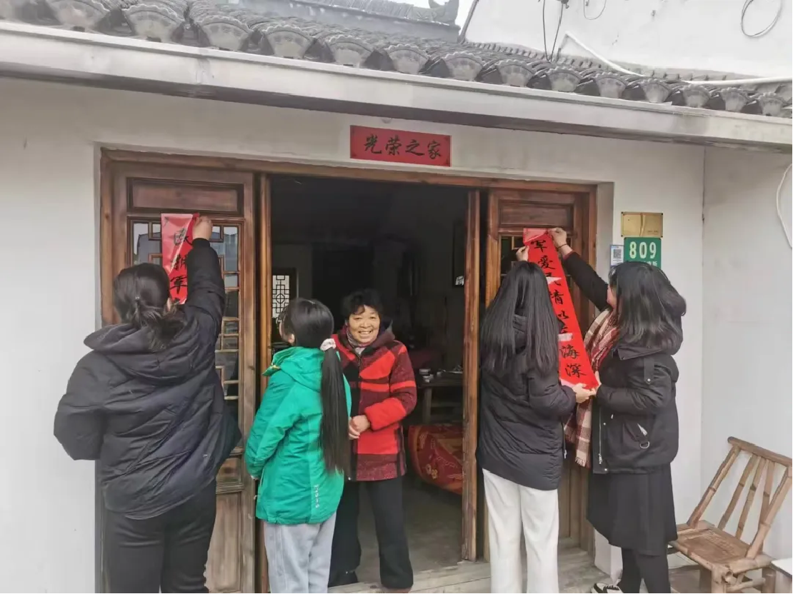第二站,其组参与了村委组织的送温暖,贴春联活动:“除了我们的参与外,还有村中正在参加寒假假日公司的小朋友一起参加。送去春联和祝福时,我们不仅感受到了老人们的笑意,还感受到了老兵的温暖和感激,也深切地体会到了志愿服务的重要性和意义。去贴春联,不仅仅是一个简单的传统习俗,更是我们向老人们表达敬意和关心的一种方式。”