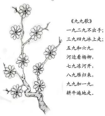 一九二九不出手;三九四九冰上走;五九和六九,河边看杨柳,七九冻河开,八九燕归来,九九加一九,耕牛遍地走。