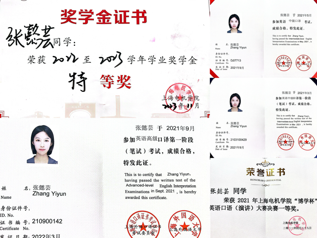 在明确目标后,张懿芸开始对自己的大学四年的学习生涯进行清晰的规划,设定了清晰的年计划、月计划、日计划,并一一付出实践。专业绩点排名第一、获得学业特等奖奖学金和上海市奖学金、斩获全国老员工国际英语能力挑战杯特等奖、考取英语高级口译笔试证书。