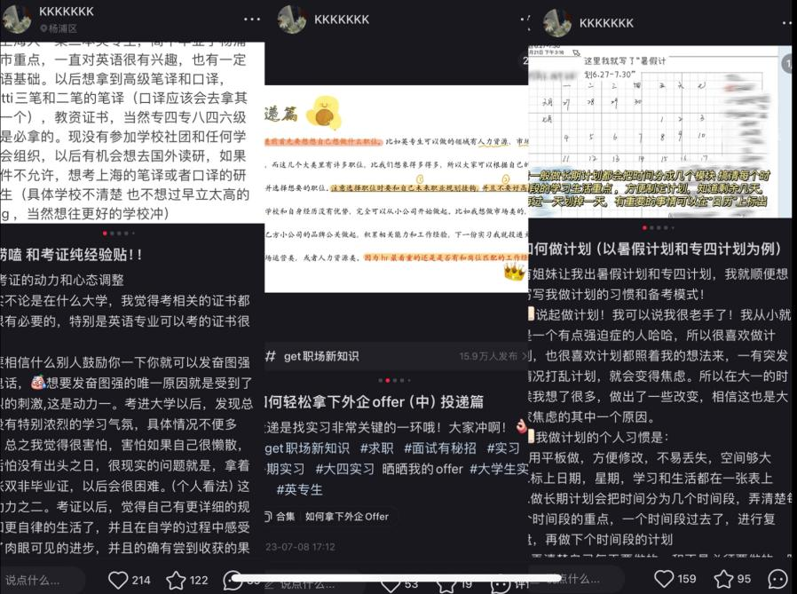 社交平台的流行,让张懿芸看到了契机,她将自己所学整理成干货的方式分享在社交平台上,她发布了各类知识与实践型笔记281篇,如跨文化知识,跨文化相关岗位实习经验帖等。如今她已拥有2000+名粉丝,1.2万点赞收藏,浏览人数高达5万。她真正做到将校内所学、校外实践传播到了社会上,影响了更多的人。