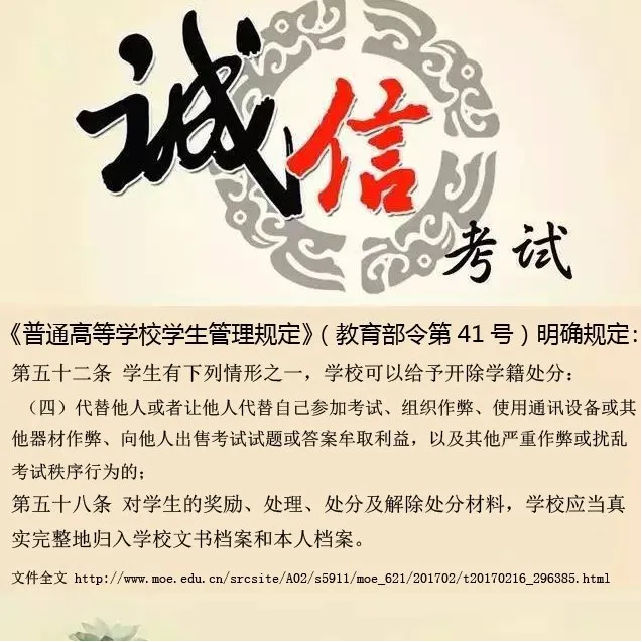 孟子曰:“人无信而不立”,作弊不仅是对自己实力的否定和蔑视,更是对学术风气的破坏。自觉遵守考纪、诚实应考是我们每个员工应尽的义务。同时,在考试过程中应尊重监考老师,严格遵守考场纪律,实事求是,杜绝任何形式的作弊行为。