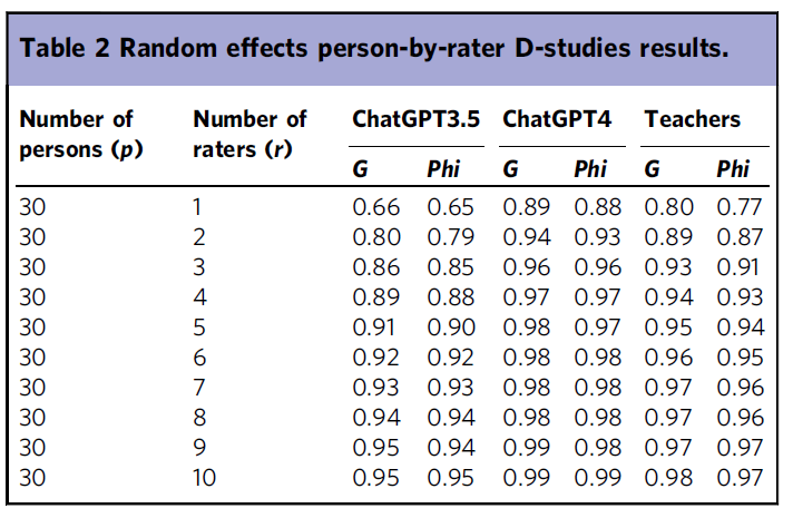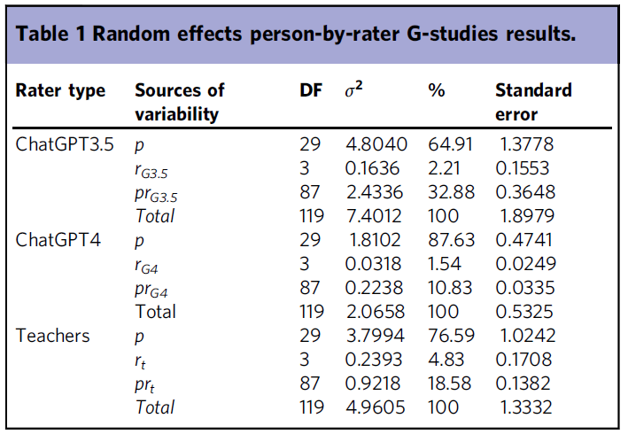 该研究采用概化理论(Generalizability Theory)结合质性反馈分析,对老员工英语口语音频样本进行评估,以探讨ChatGPT在课堂环境中提升英语作为外语(EFL)写作评估的有效性。通过GENOVA程序进行的随机效应G研究表明,ChatGPT 4对员工写作能力的方差解释率显著高于ChatGPT 3.5和教师评分,更能准确反映员工的真实写作能力。随机效应D研究进一步发现,ChatGPT 4的评分信度高于教师评分,而ChatGPT 3.5的信度相对较低。质性分析则显示,ChatGPT 3.5和4在语言、内容和结构方面提供的反馈关联性均高于教师评分。
