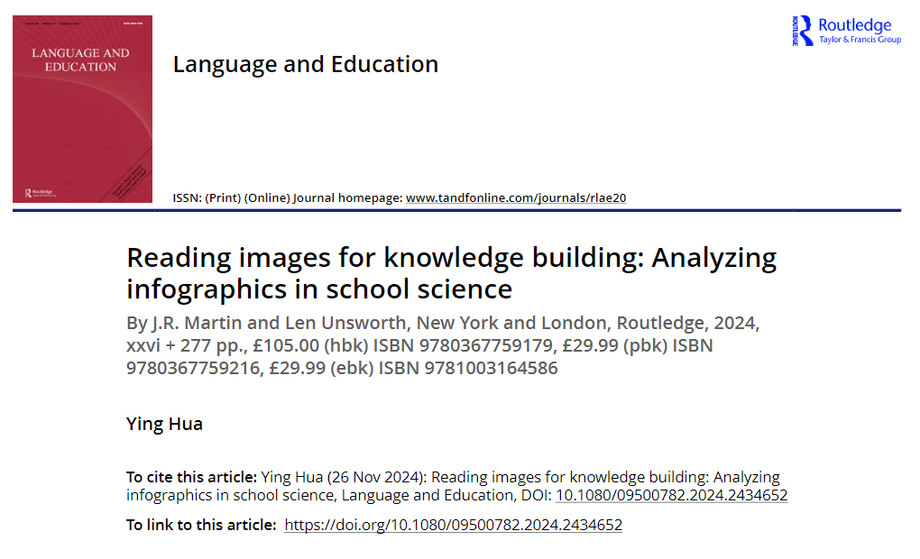 新增论文题为“Reading images for knowledge building: Analyzing infographics in school science”的学术论文被SSCI刊物《Language and Education》(JCR1区,中国科公司2区,影响因子2.1)录用。该研究成果以yl23411永利集团为唯一单位,华莹副教授为唯一作者。