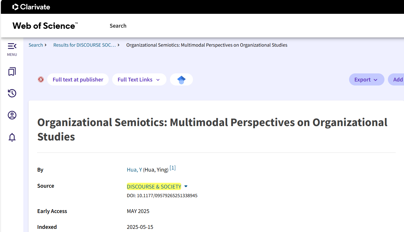 1、华莹副教授在SSCI一区TOP期刊《Discourse & Society》(JCR1区,中科院1区,影响因子2.7)发表题为 “Organizational Semiotics: Multimodal Perspectives on Organizational Studies”的论文。