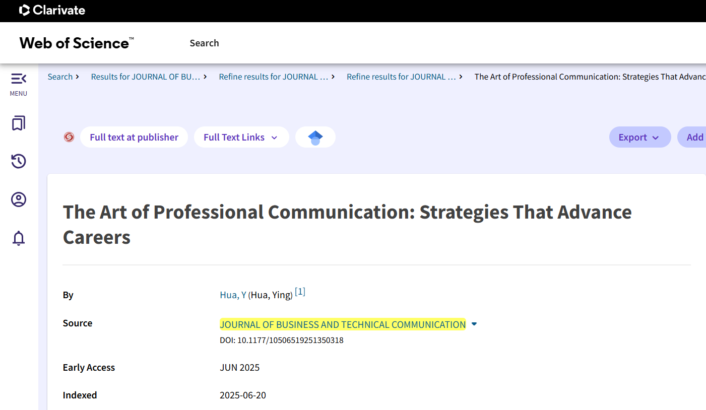 2、华莹副教授在SSCI二区期刊《Journal of Business and Technical Communication》(JCR2区,中科院2区,影响因子2.0)发表题为 “The Art of Professional Communication: Strategies That Advance Careers”的论文。