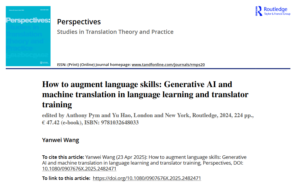 3、王艳伟博士在SSCI二区期刊《Perspectives: Studies in Translation Theory and Practice》发表论文“How to augment language skills: Generative AI and machine translation in language learning and translator training”。